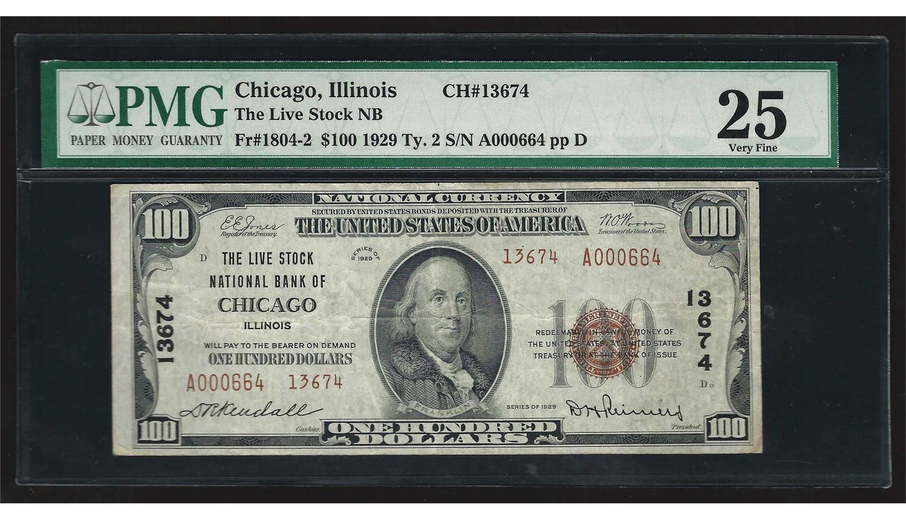 One 1929 $100 National Bank Chicago Note Charter # 13674 PMG VF25. PMG Certified.