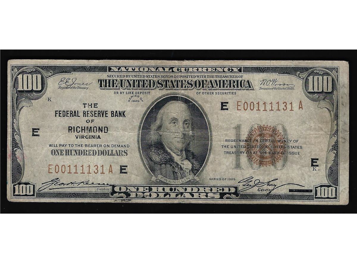 One 1929 $100 The Federal Reserve Bank of Richmond VA Note.