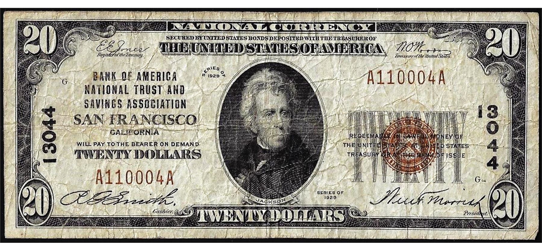 1929 $20 Bank of America San Francisco, CA CH# 13044 National Currency Note