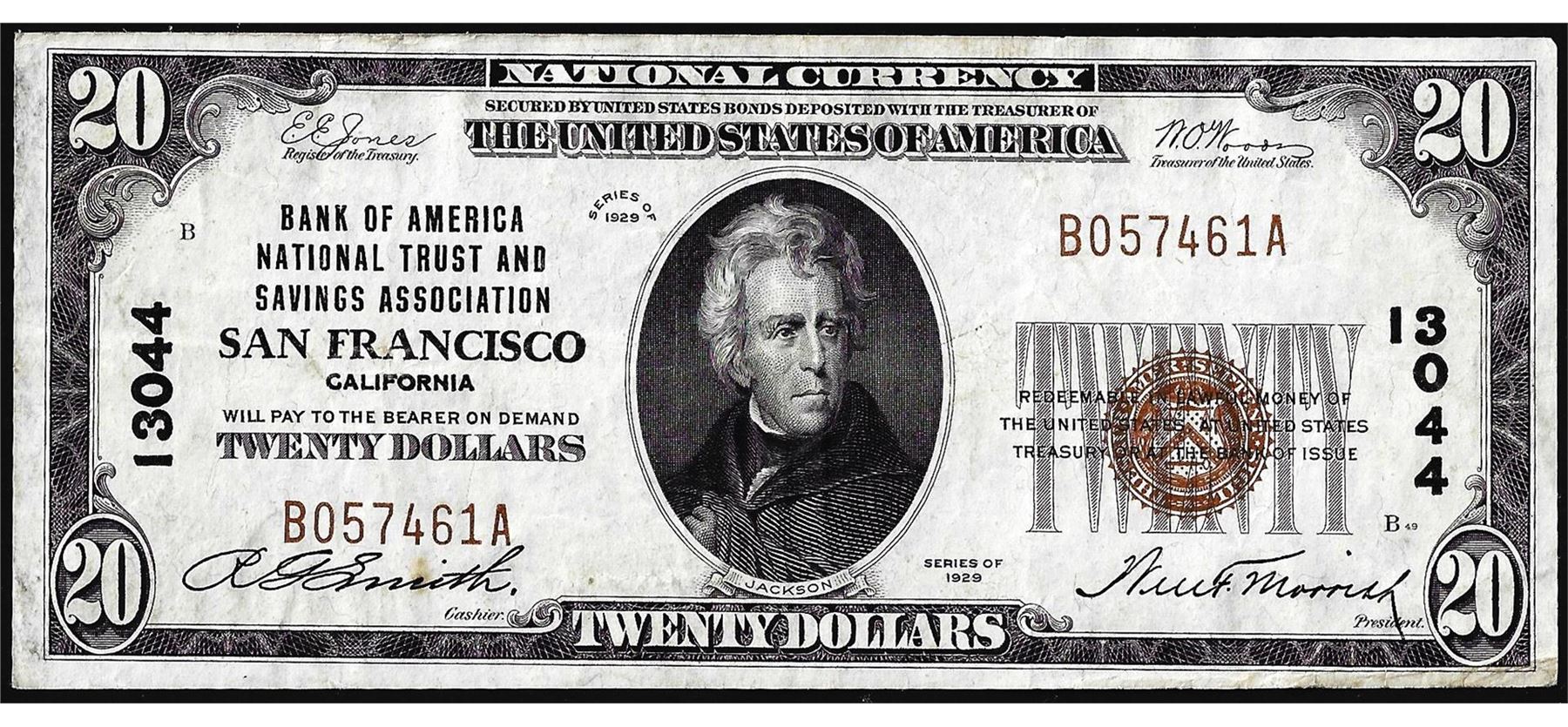 One 1929 $20 BofA National Trust & Savings San Francisco, CA CH# 13044 National Currency Note.