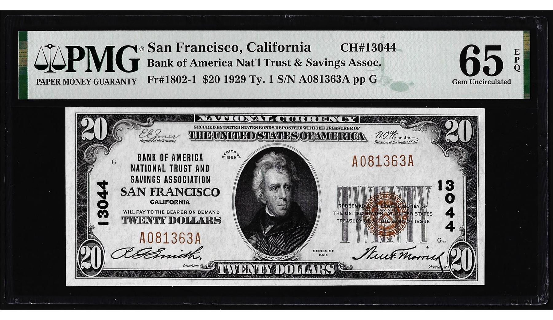 One 1929 $20 BofA San Francisco, CA CH# 13044 National Currency Note PMG Gem Uncirculated 65EPQ. PMG Certified.