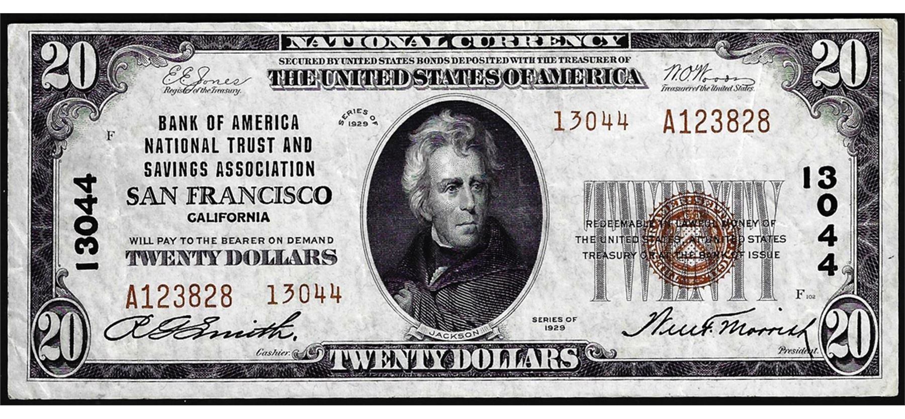 One 1929 $20 BofA San Francisco, CA CH# 13044 National Currency Note.