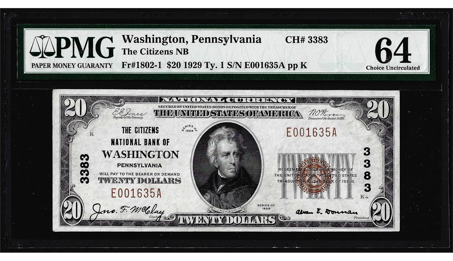 One 1929 $20 Citizens NB Washington, PA CH# 3383 National Note PMG Choice Uncirculated 64. PMG Certified.