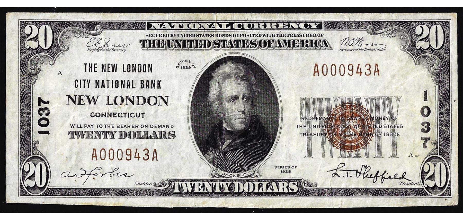 1929 $20 City National Bank New London, CT CH# 1037 National Currency Note