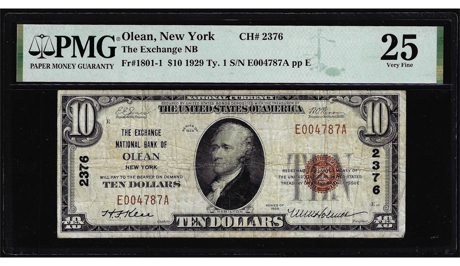 One 1929 $20 Exchange NB of Olean, NY CH# 2376 National Currency Note PMG Very Fine 25. PMG Certified.