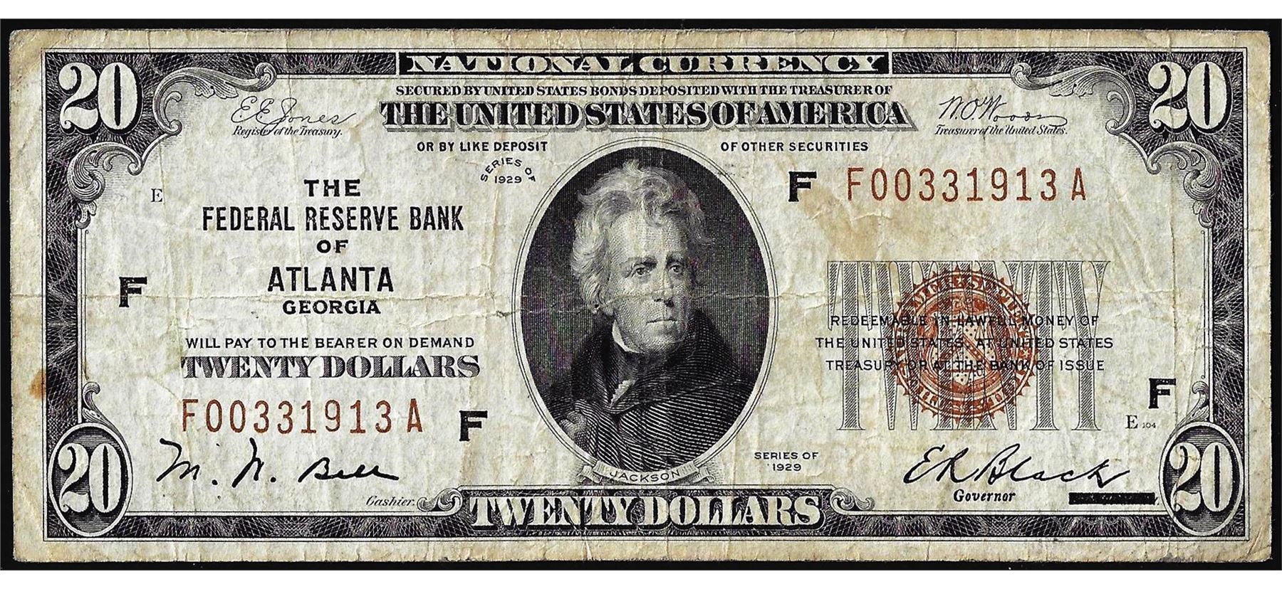 One 1929 $20 Federal Reserve Bank Note Atlanta.