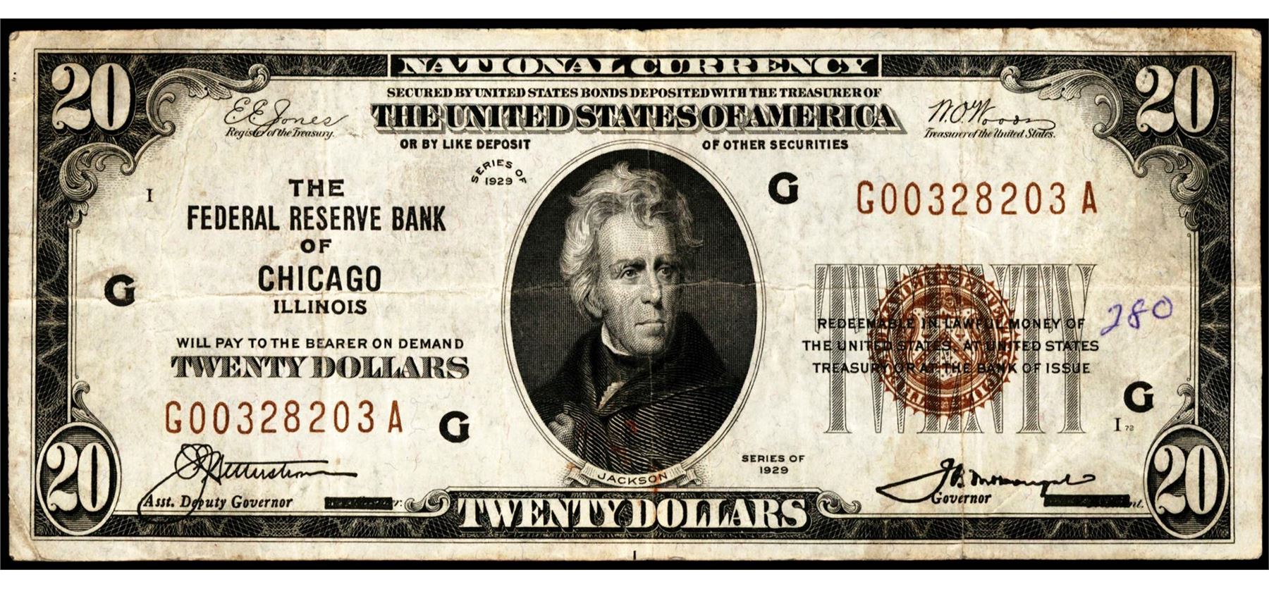 One 1929 $20 Federal Reserve Bank Note Chicago.