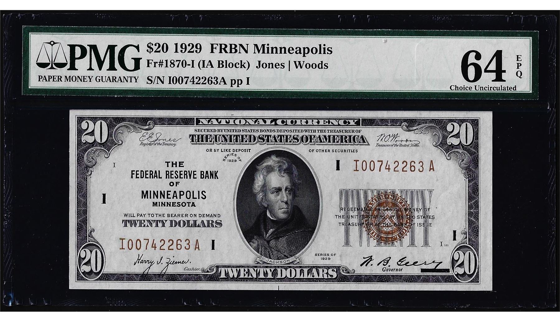 One 1929 $20 Federal Reserve Bank Note Minneapolis Fr.1870-I PMG Ch. Uncirculated 64EPQ. PMG Certified.