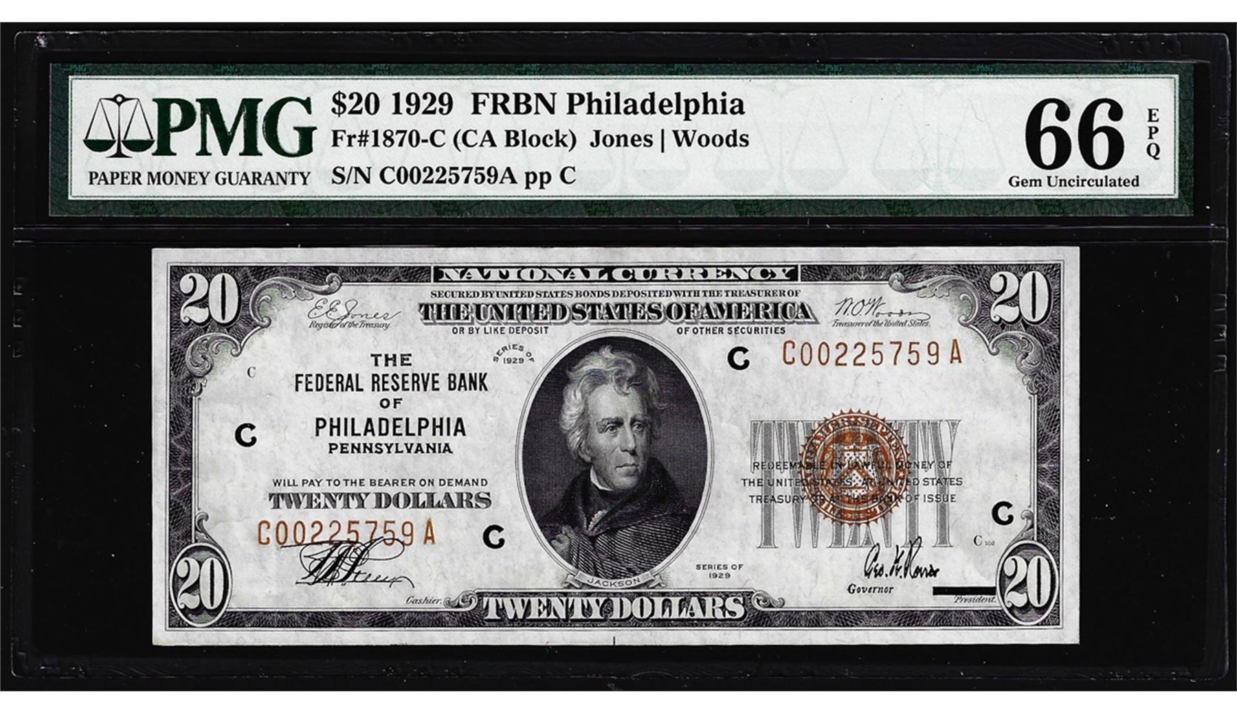 1929 $20 Federal Reserve Bank Note Philadelphia Fr.1870-C PMG Gem Uncirculated 66EPQ