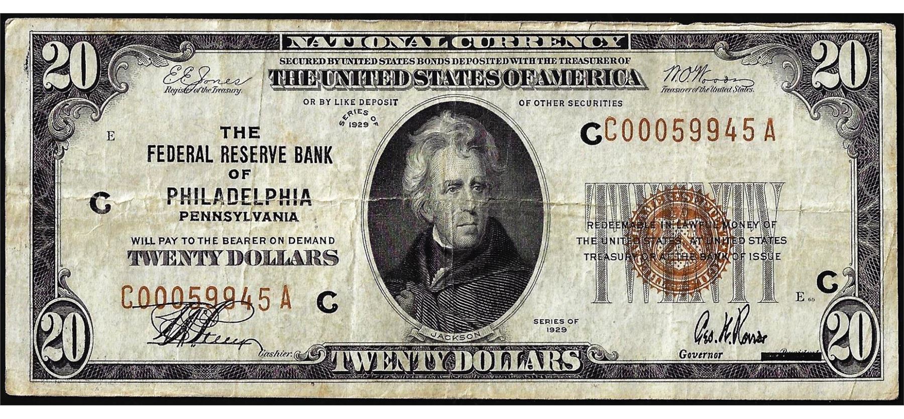 One 1929 $20 Federal Reserve Bank Note Philadelphia.