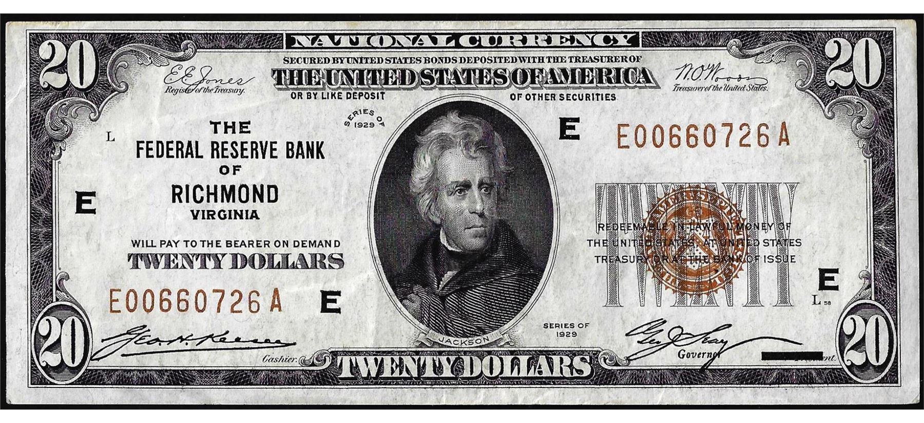 One 1929 $20 Federal Reserve Bank Note Richmond.