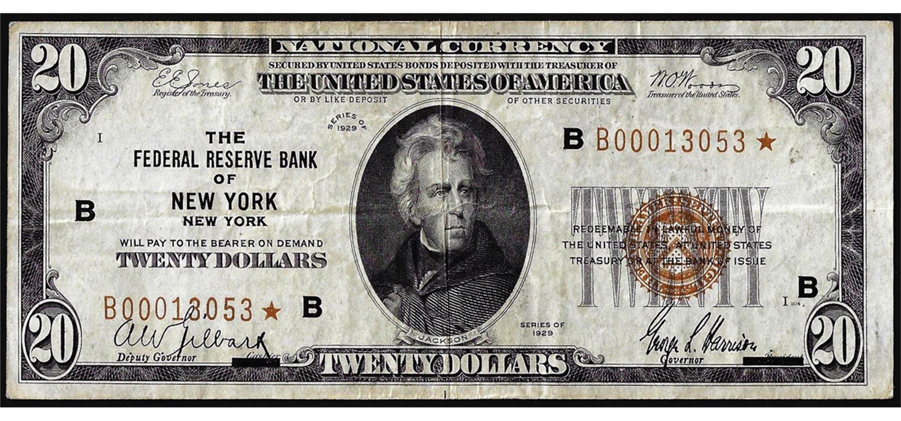 One 1929 $20 Federal Reserve Bank STAR Note New York.