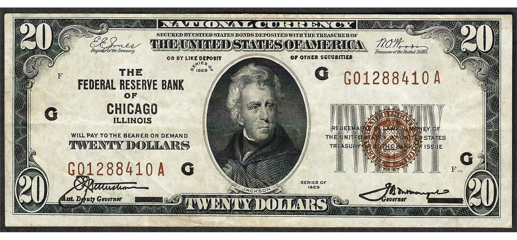 One 1929 $20 Federal Reserve Bank of Chicago Note.