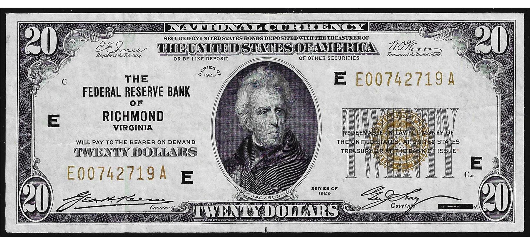 One 1929 $20 Federal Reserve Bank of Richmond National Currency Note.
