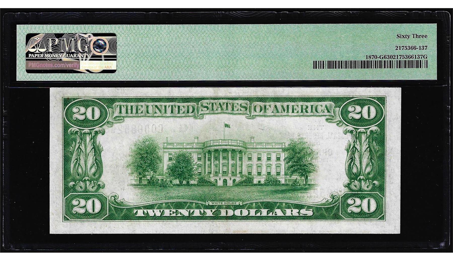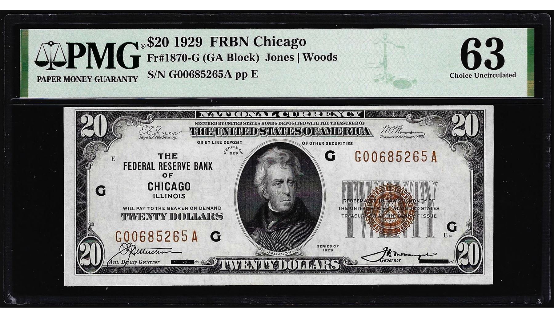 1929 $20 Federal Reserve Note Chicago Fr.1870-G PMG Choice Uncirculated 63