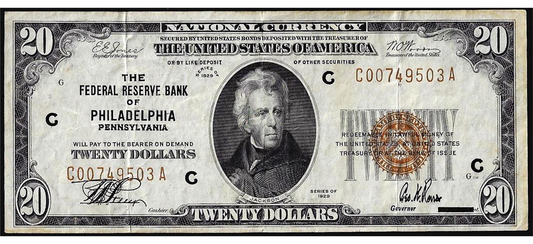 One 1929 $20 Federal Reserve Note Philadelphia.