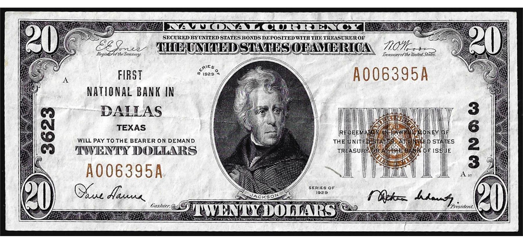One 1929 $20 First NB in Dallas, TX CH# 3623 National Currency Note.