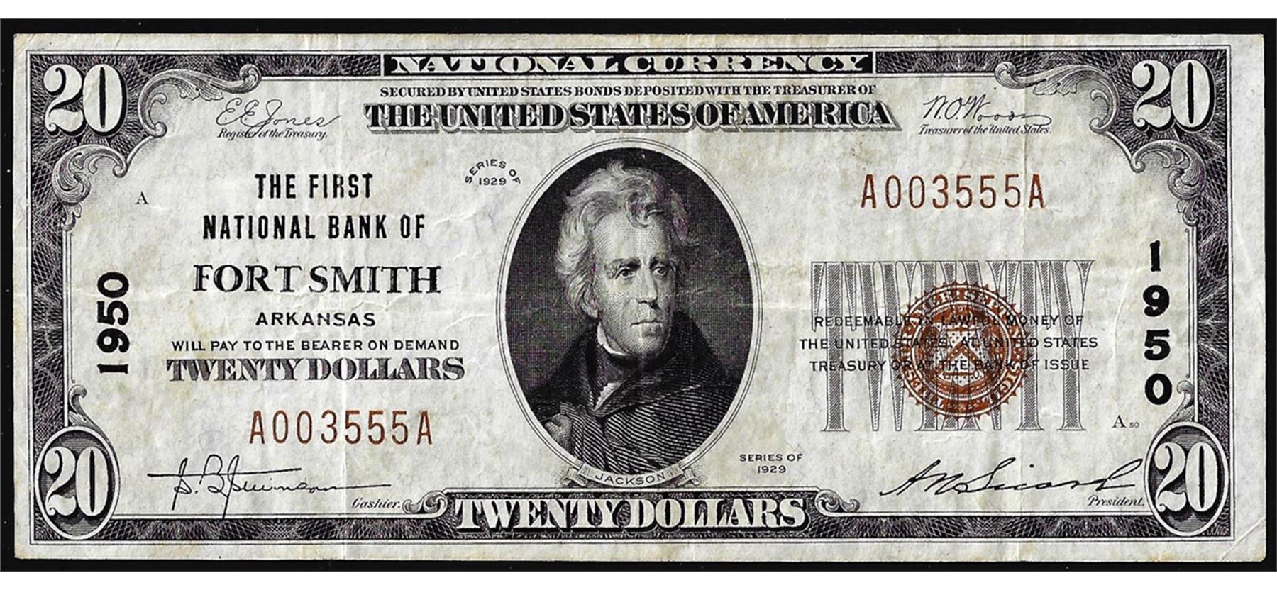One 1929 $20 First NB of Fort Smith, Arkansas CH# 1950 National Currency Note.