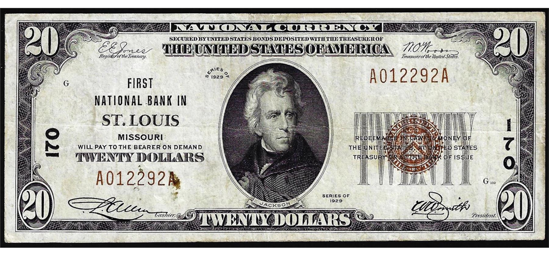 One 1929 $20 First NB of St. Louis, MO CH# 170 National Currency Note.