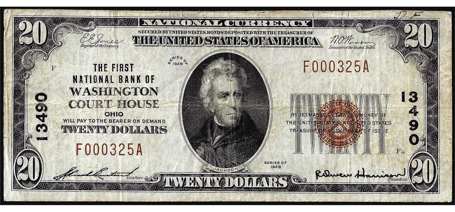 One 1929 $20 First NB of Washington Court House, Ohio CH# 13490 National Currency Note.