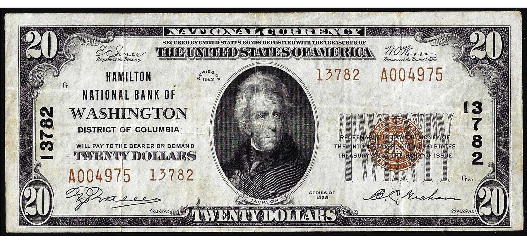 One 1929 $20 Hamilton NB of Washington, D.C. CH# 13782 National Currency Note.