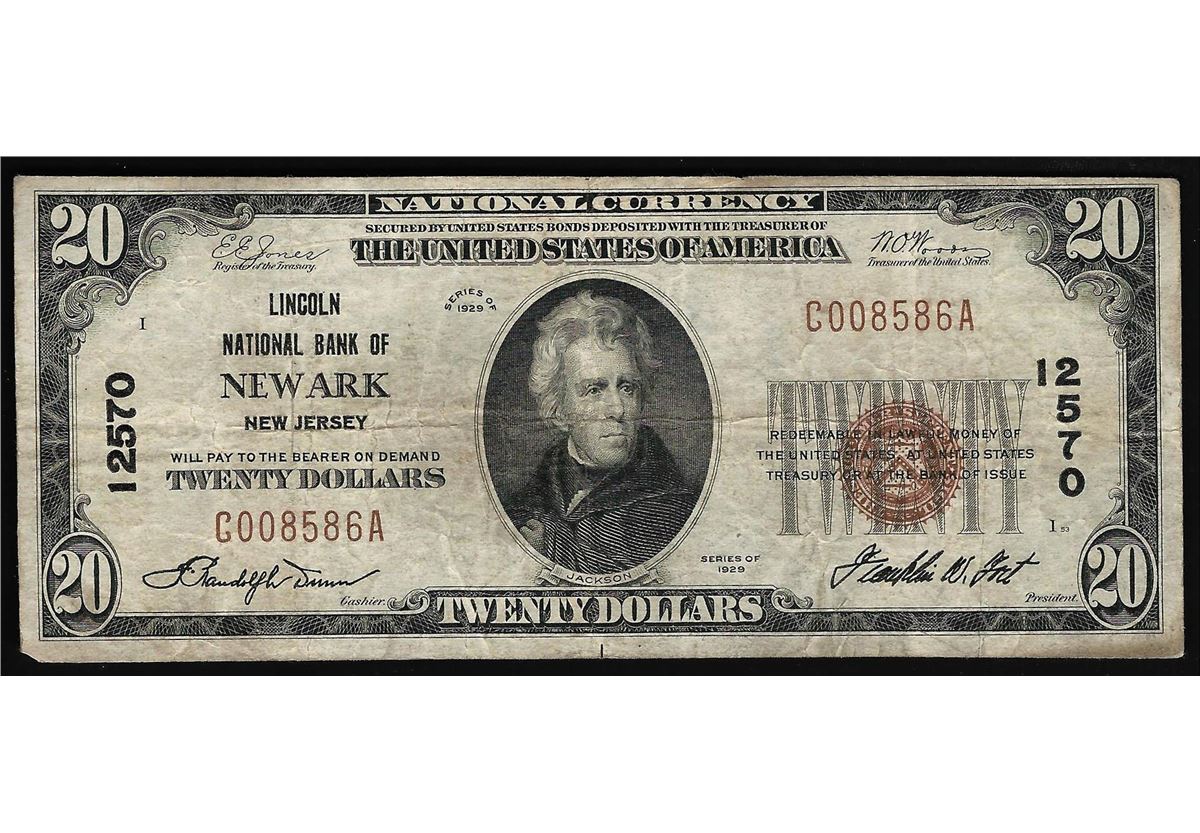 One 1929 $20 Lincoln National Bank of Newark New Jersey National Currency Note.
