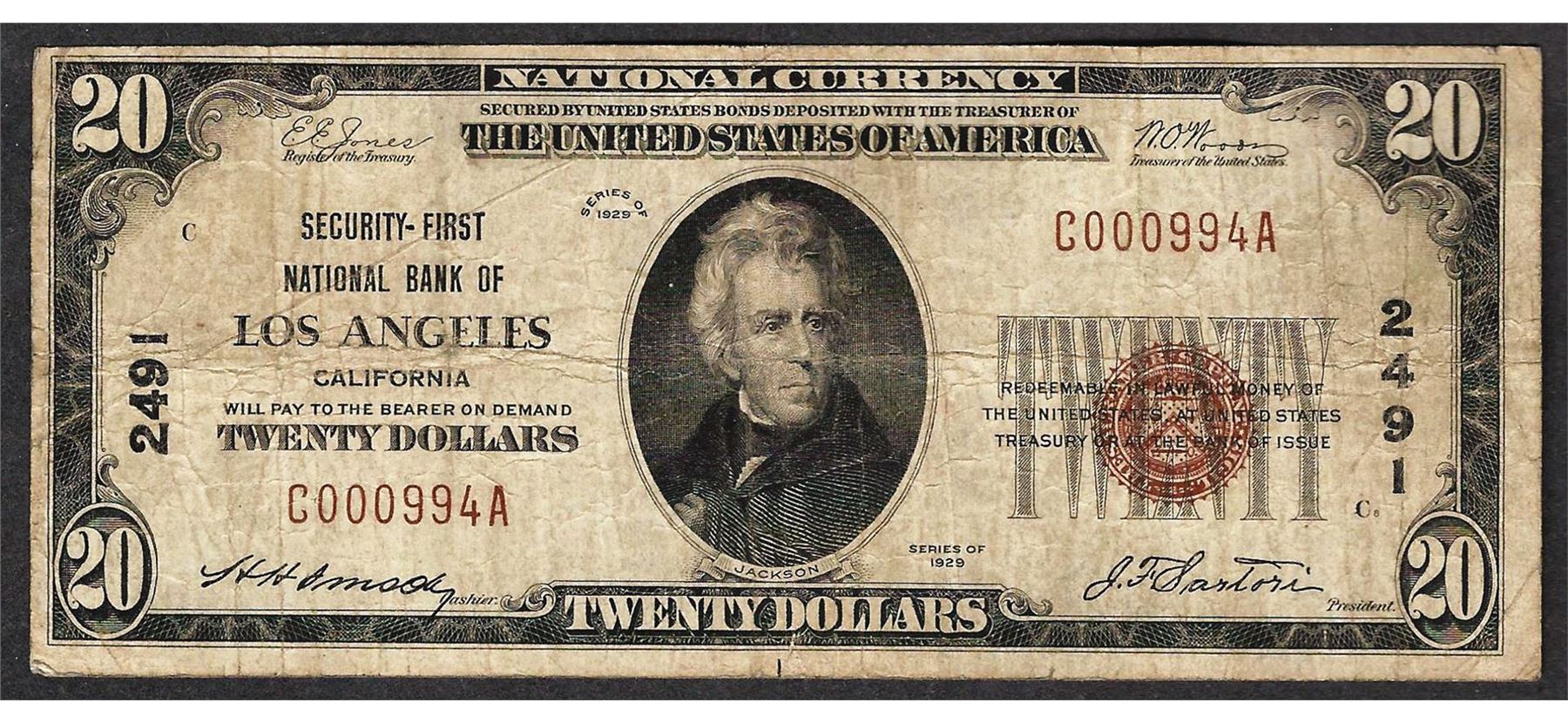 One 1929 $20 Los Angeles California National Currency Note CH# 2491.