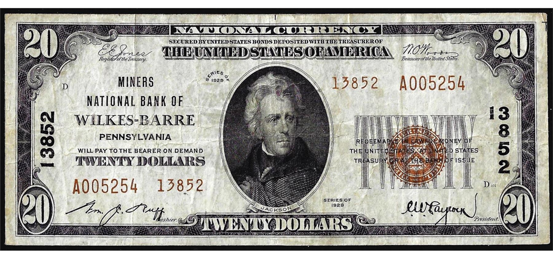 1929 $20 Miners NB Wilkes-Barre, PA CH# 13852 National Currency Note