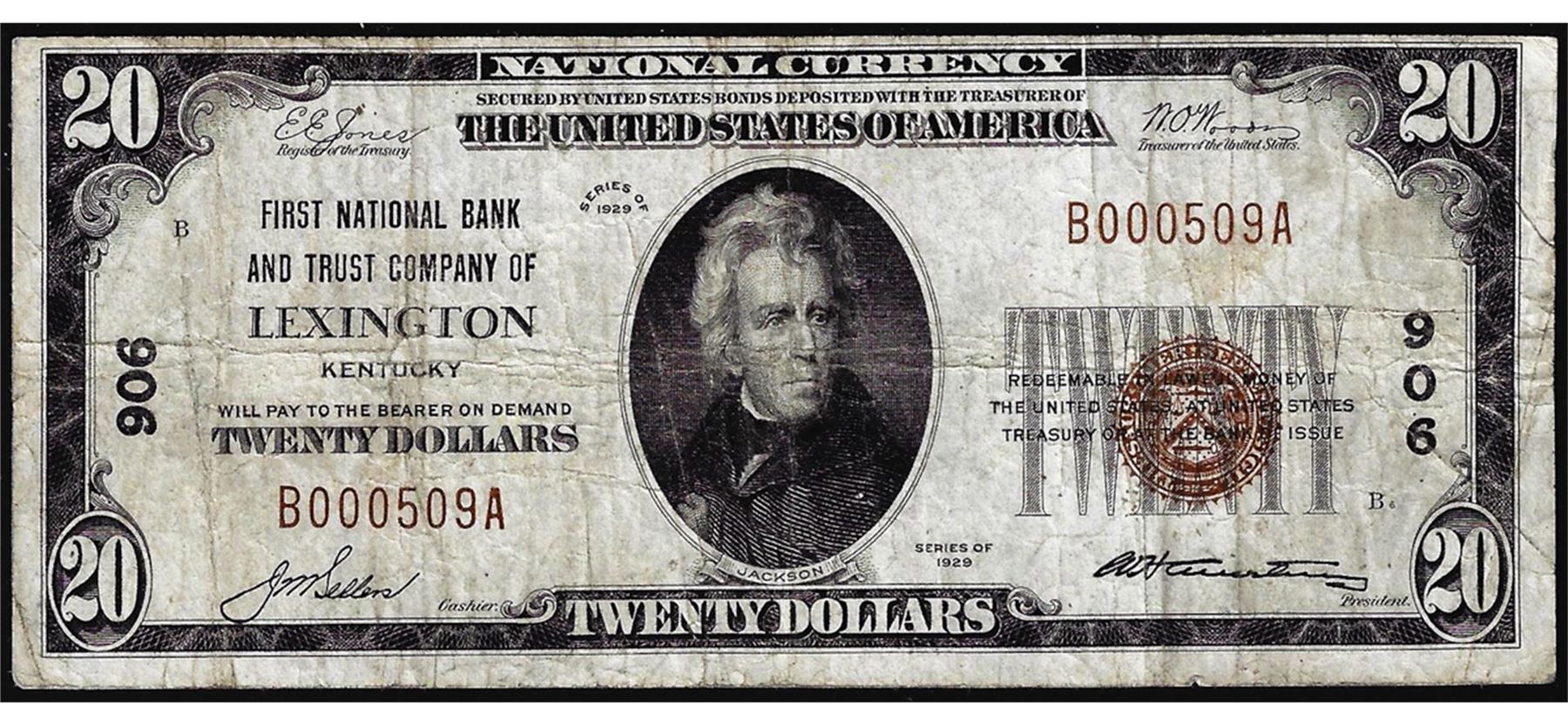 One 1929 $20 NB & Trust Lexington, KY CH# 906 National Currency Note.