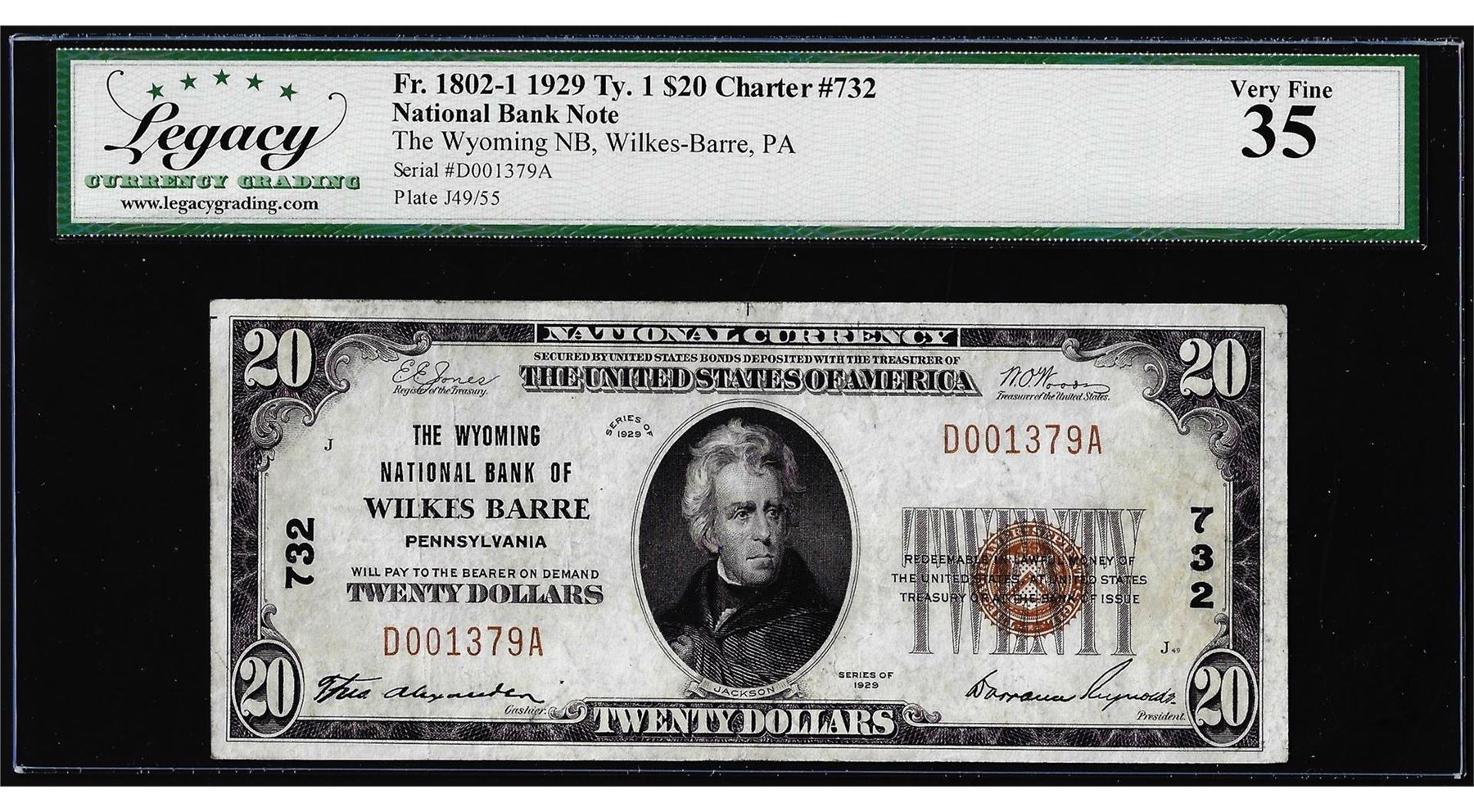 One 1929 $20 NB Wilkes-Barre, PA CH# 732 Fr.1802-1 National Currency Note Legacy VF35. Legacy Graded.