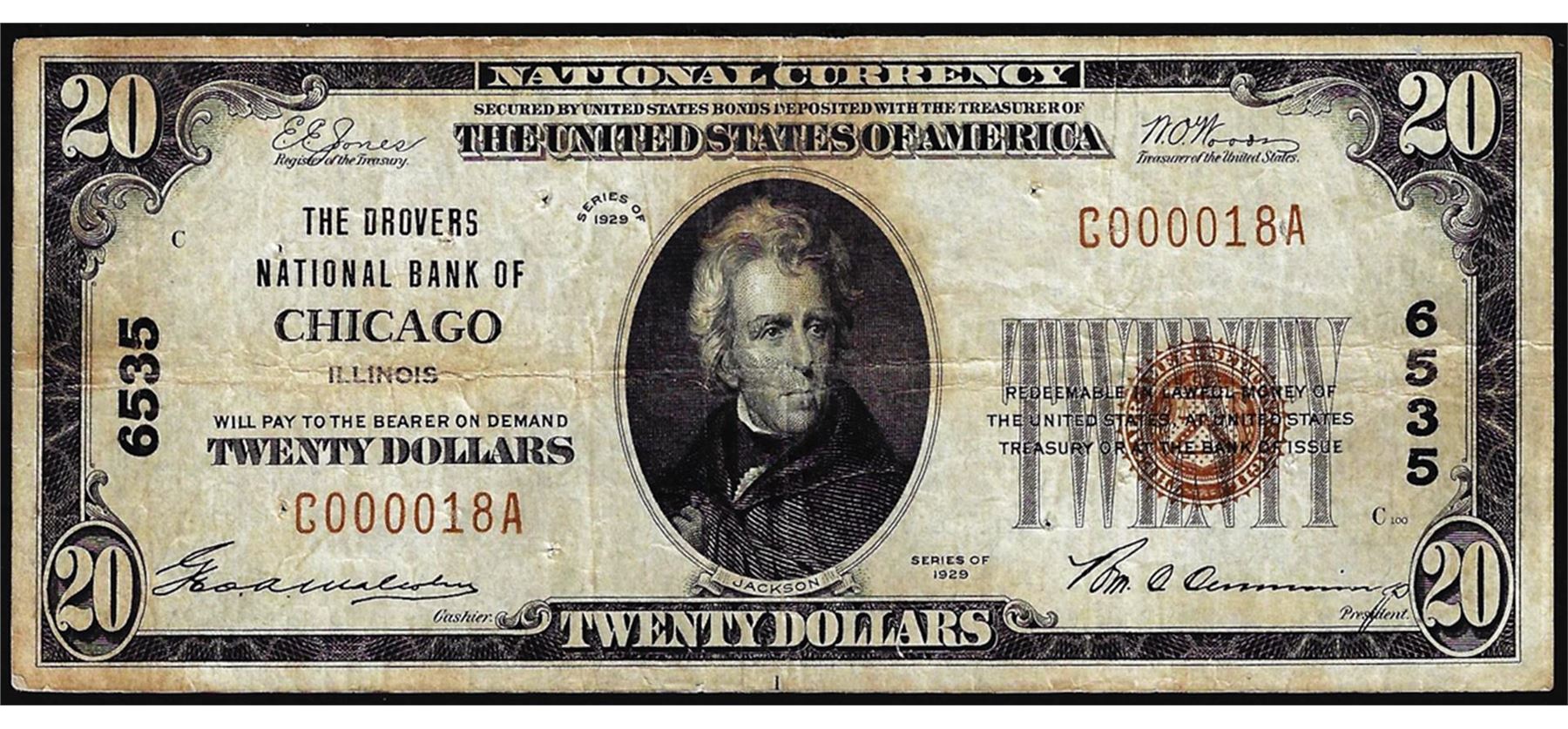 One 1929 $20 NB of Chicago, IL CH# 6535 National Currency Note.