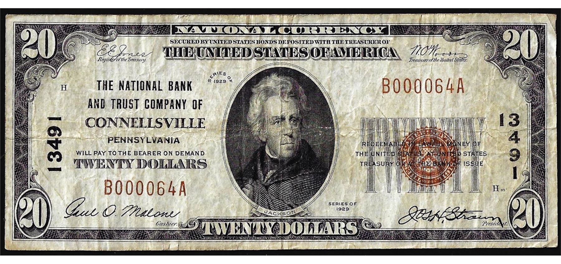 One 1929 $20 NB of Connellsville, PA CH# 13491 National Currency Note Low Serial Number.