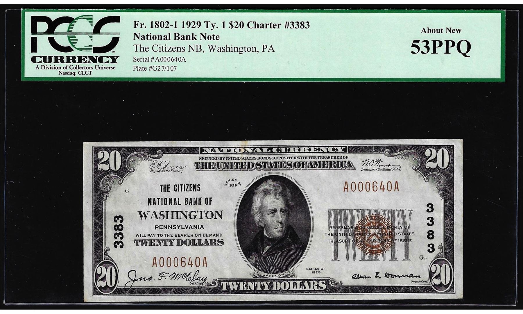 One 1929 $20 NB of Washington, PA CH# 3383 National Currency Note PCGS About New 53PPQ. PCGS Graded.