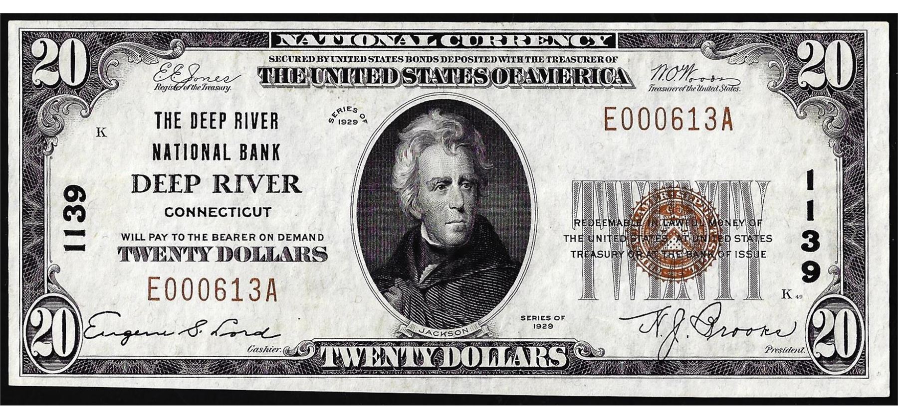 One 1929 $20 National Bank Deep River, Connecticut CH# 1139 National Currency Note.