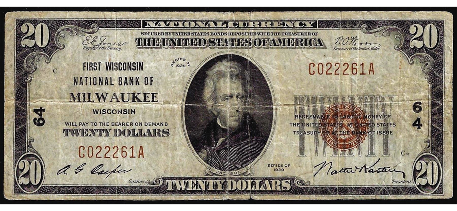 One 1929 $20 National Bank Milwaukee, WI CH# 64 National Currency Note.