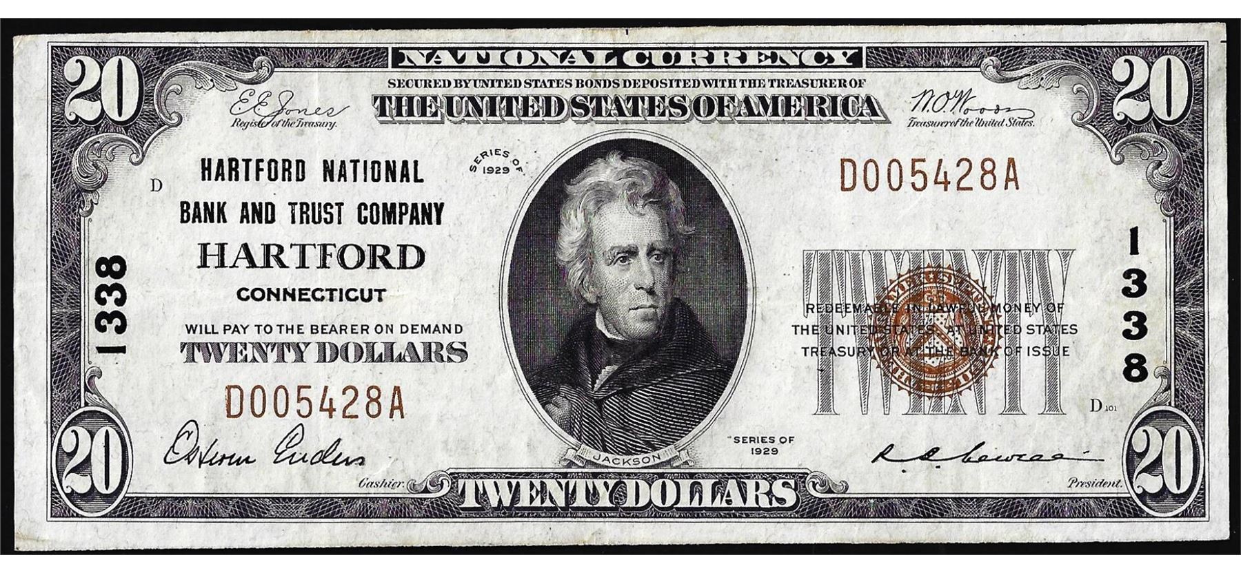 One 1929 $20 National Bank and Trust Co. Hartford, CT CH# 1338 National Currency Note.