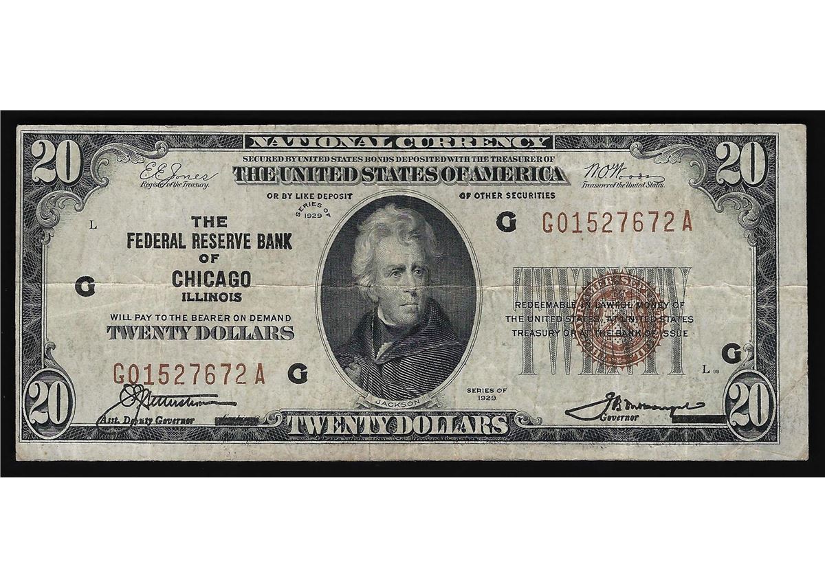 One 1929 $20 National Currency Chicago Illinois Note.