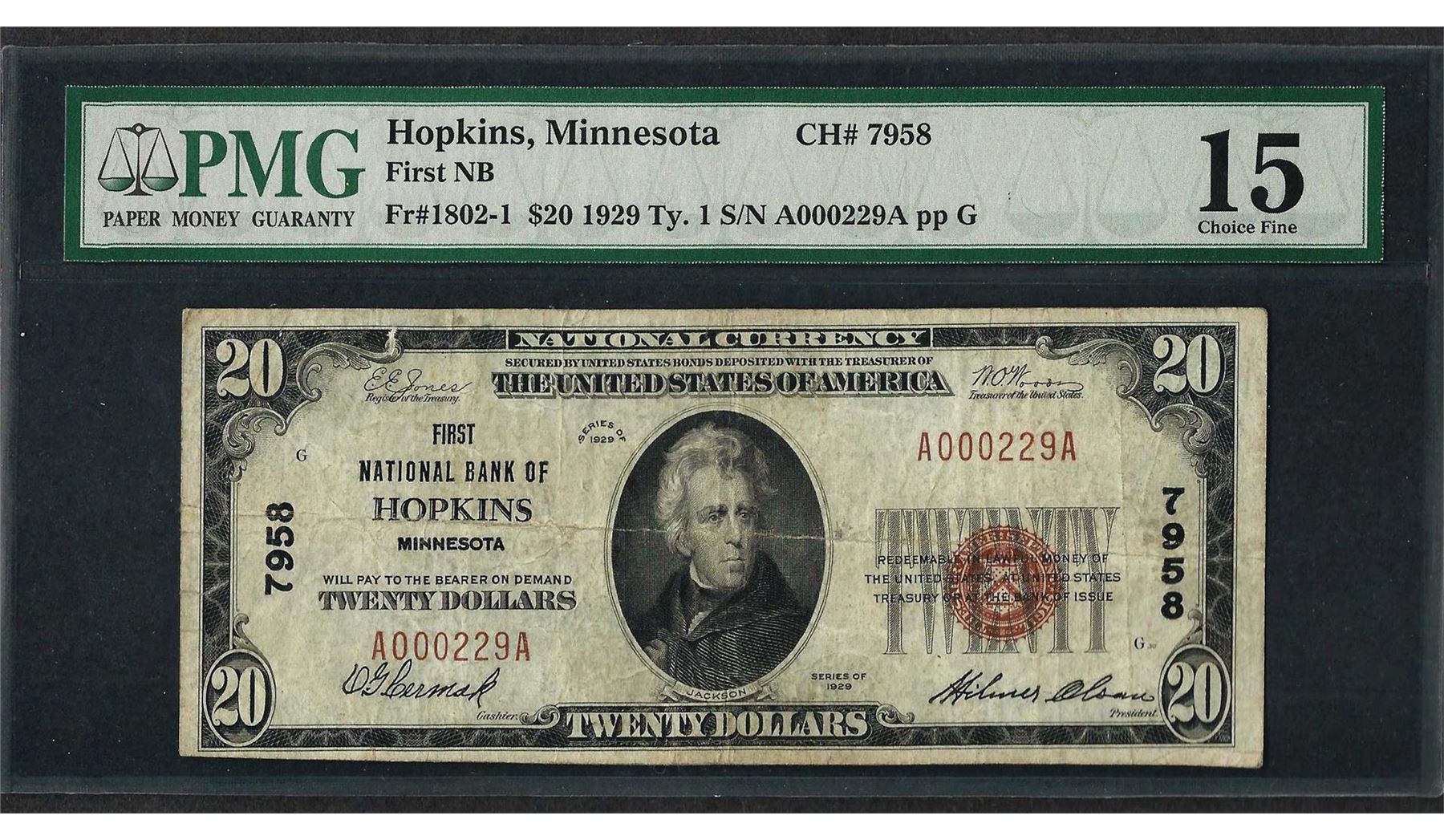 One 1929 $20 National Currency Note Hopkins, MN CH# 7958 PMG Choice Fine 15. PMG Certified.