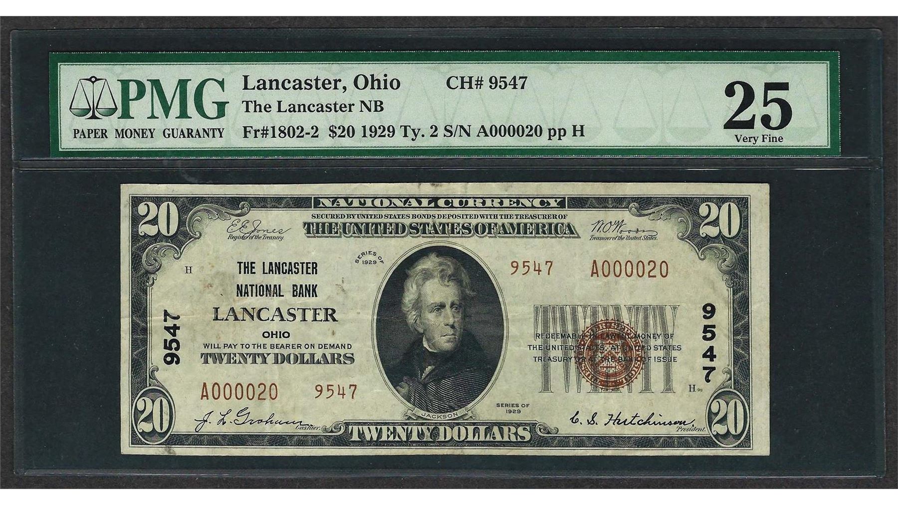 One 1929 $20 National Currency Note Lancaster, Ohio CH# 9547 PMG Very Fine 25 LOW SERIAL. PMG Certified.
