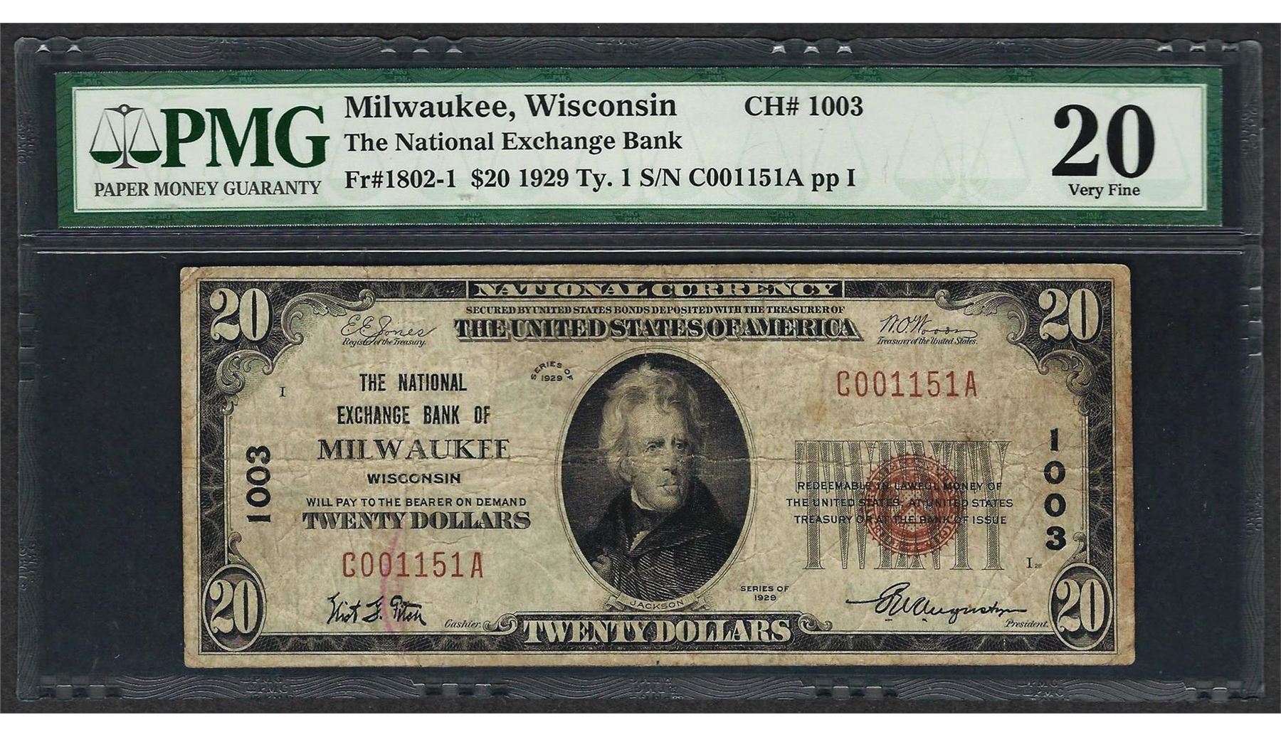 1929 $20 National Currency Note Milwaukee, Wisconsin CH# 1003 PMG Very Fine 20