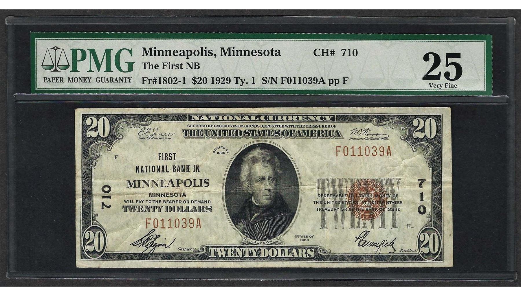 One 1929 $20 National Currency Note Minneapolis, Minnesota CH# 710 PMG Very Fine 25. PMG Certified.