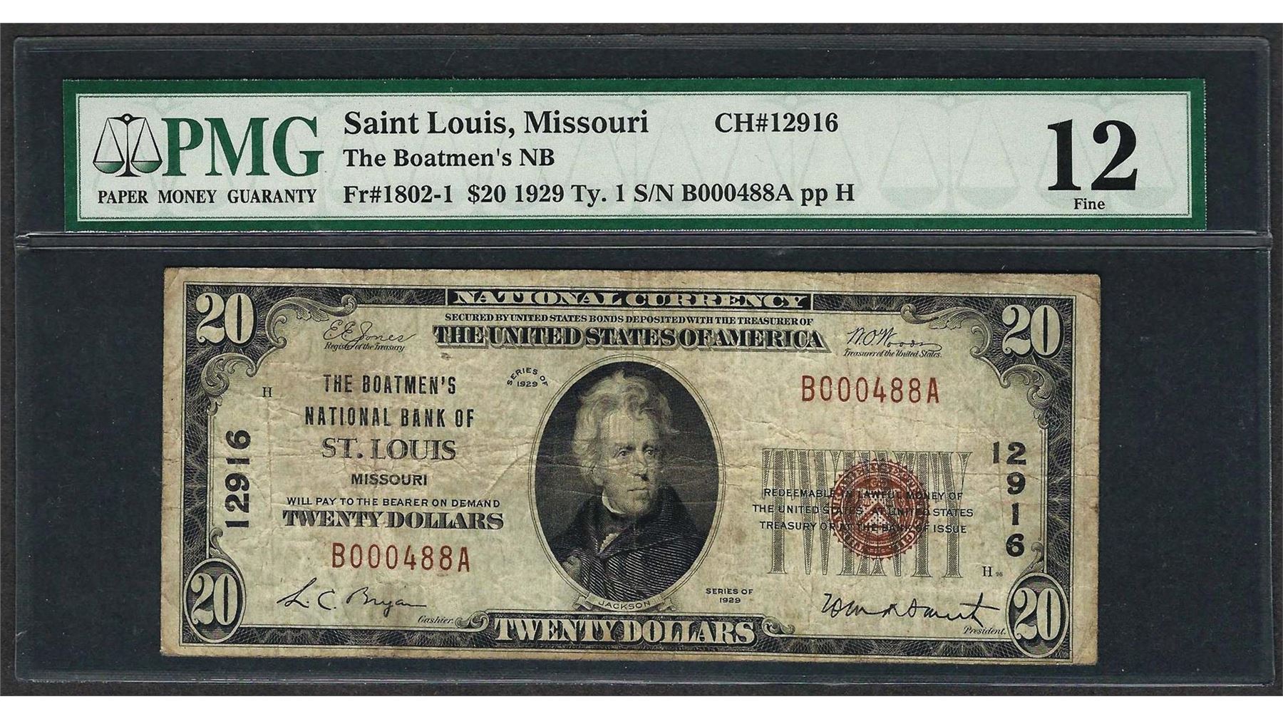 One 1929 $20 National Currency Note Saint Louis, Missouri CH# 12916 PMG Fine 12. PMG Certified.