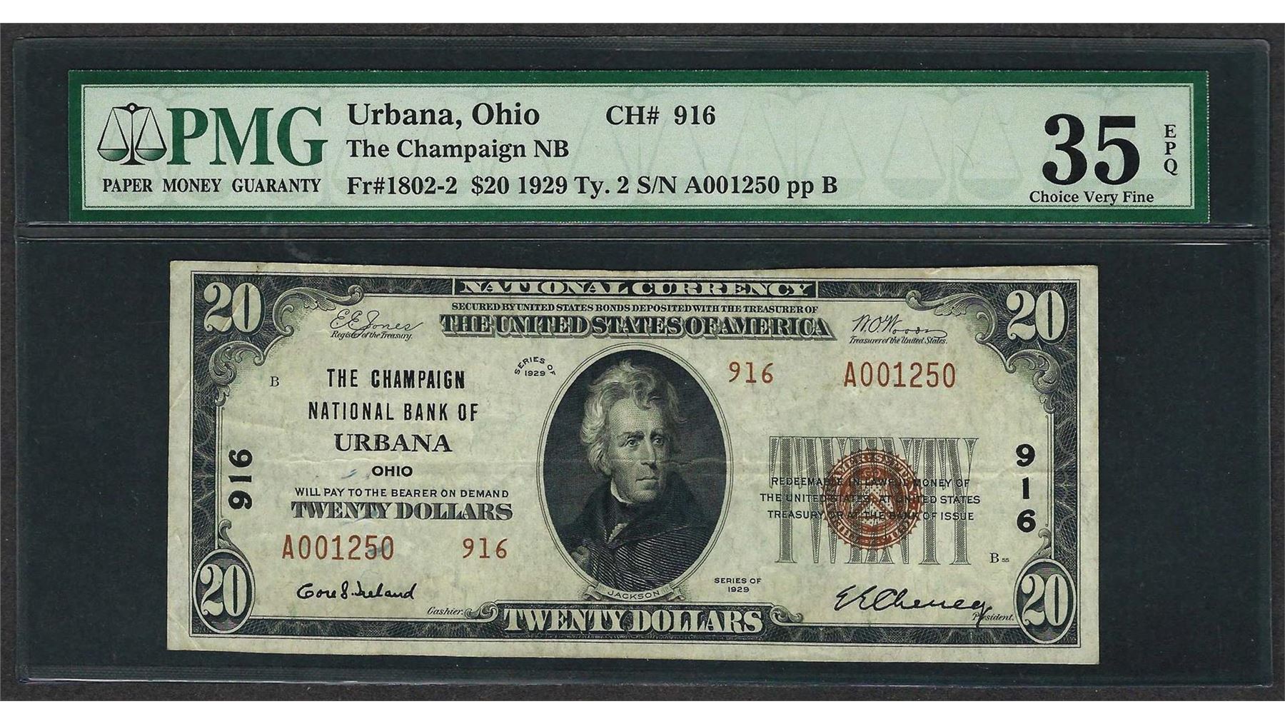 One 1929 $20 National Currency Note Urbana, Ohio CH# 916 PMG Very Fine 35EPQ. PMG Certified.