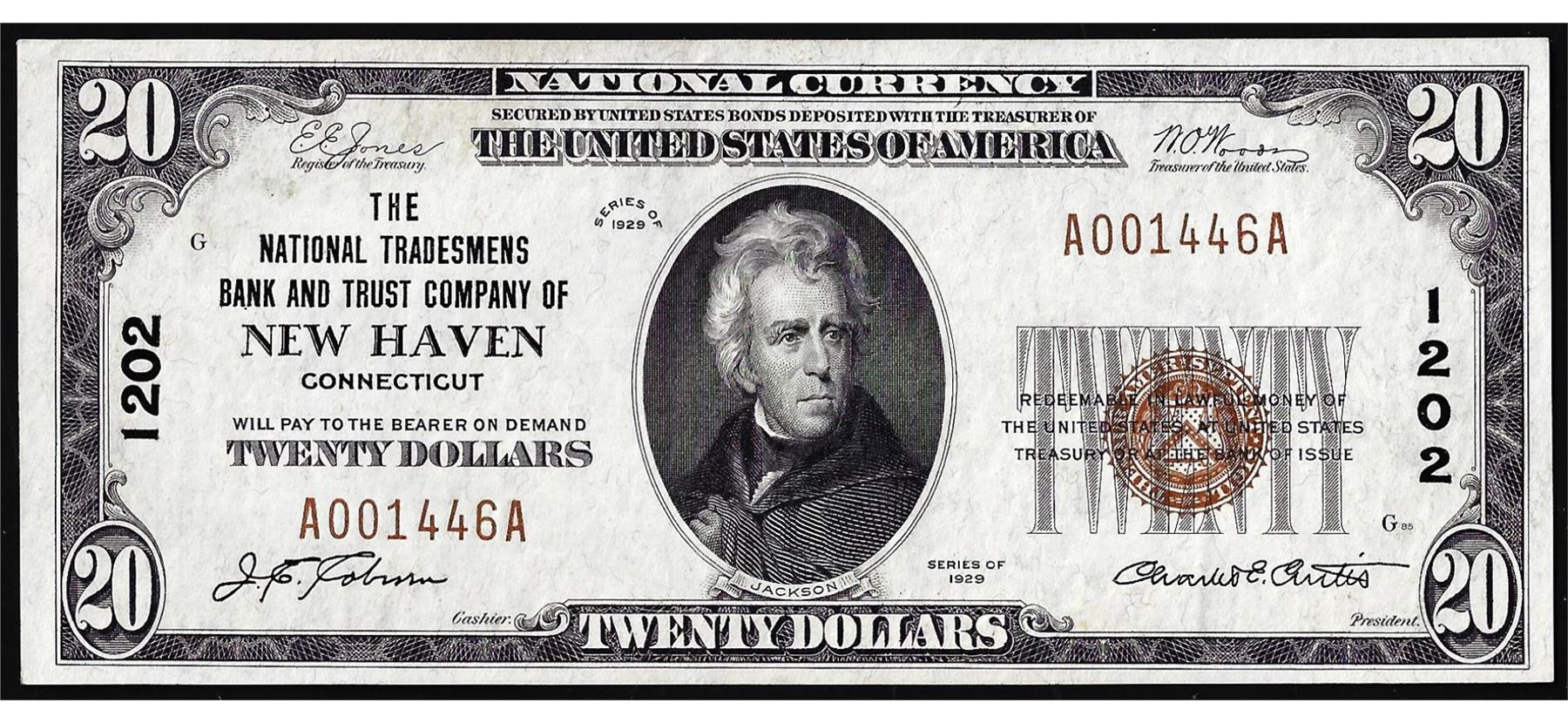 One 1929 $20 National Tradesman Bank of New Haven, CT CH# 1202 National Currency Note.