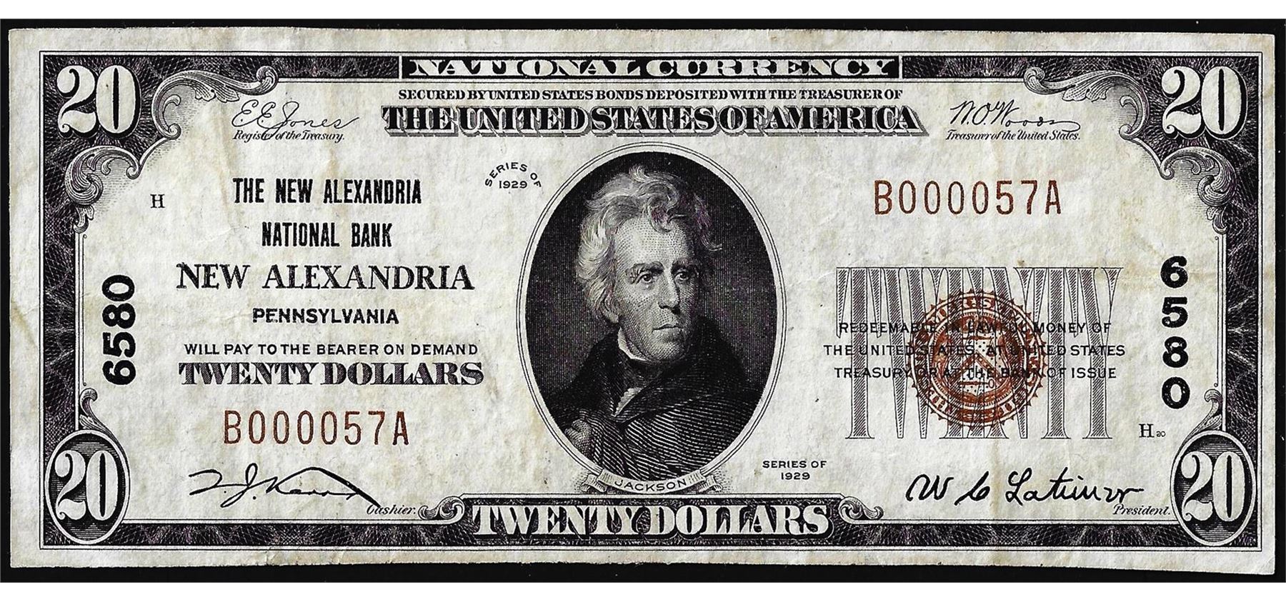 One 1929 $20 New Alexandria National Bank, PA CH# 6580 National Currency Note Low Serial.