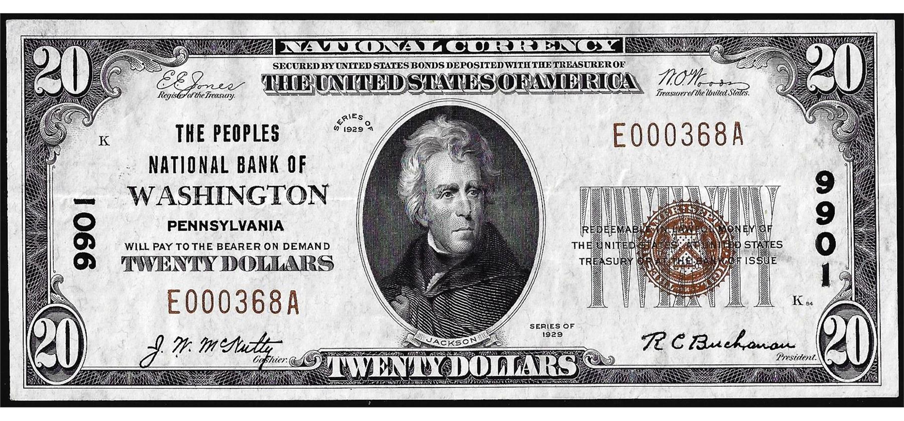 One 1929 $20 Peoples NB of Washington, Pennsylvania CH# 9901 National Currency Note.