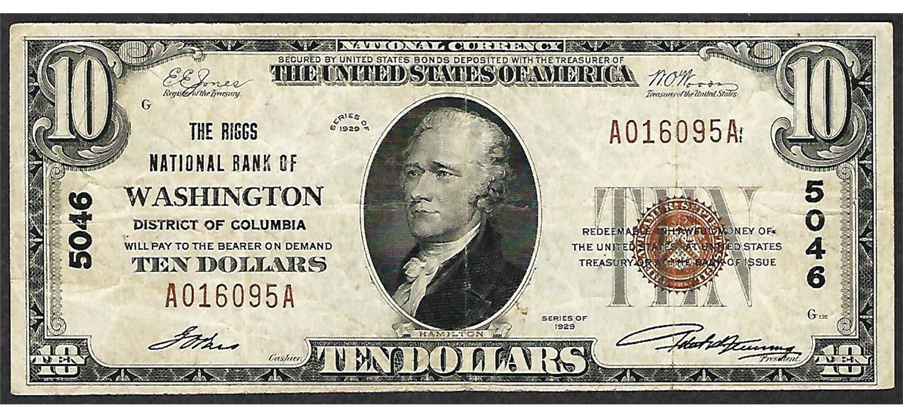 One 1929 $20 Riggs NB of Washington, District of Columbia CH# 5046 National Currency Note.