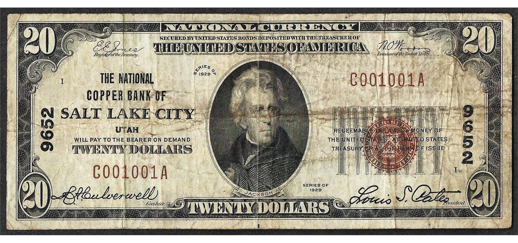 1929 $20 Salt Lake City Utah National Currency Note CH #9652