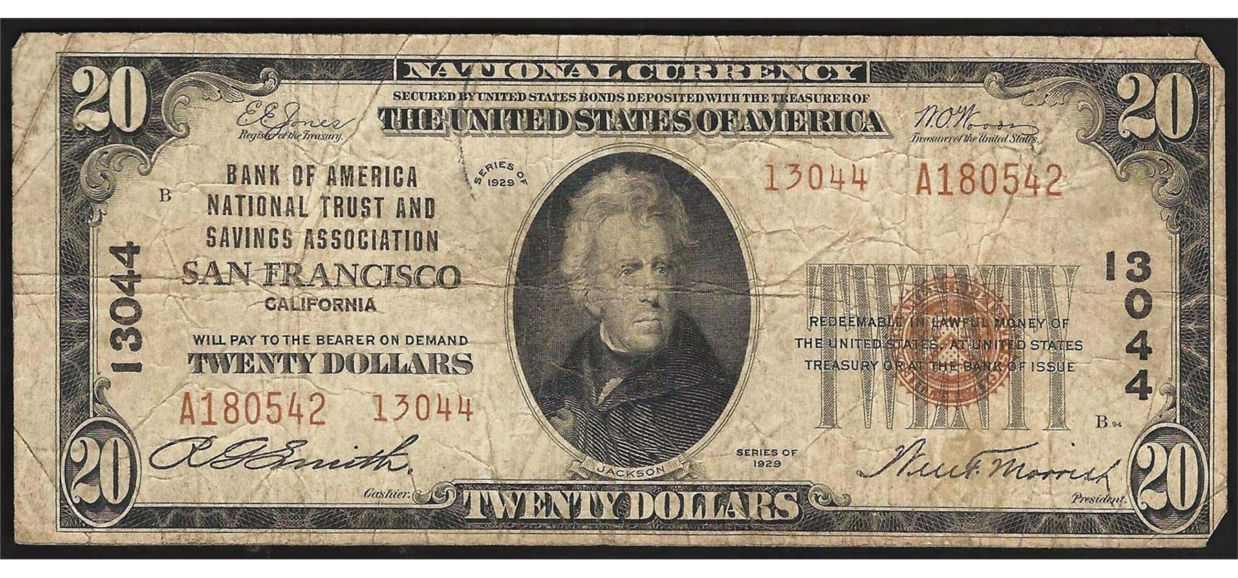 One 1929 $20 San Francisco CA National Currency Note CH# 13044.
