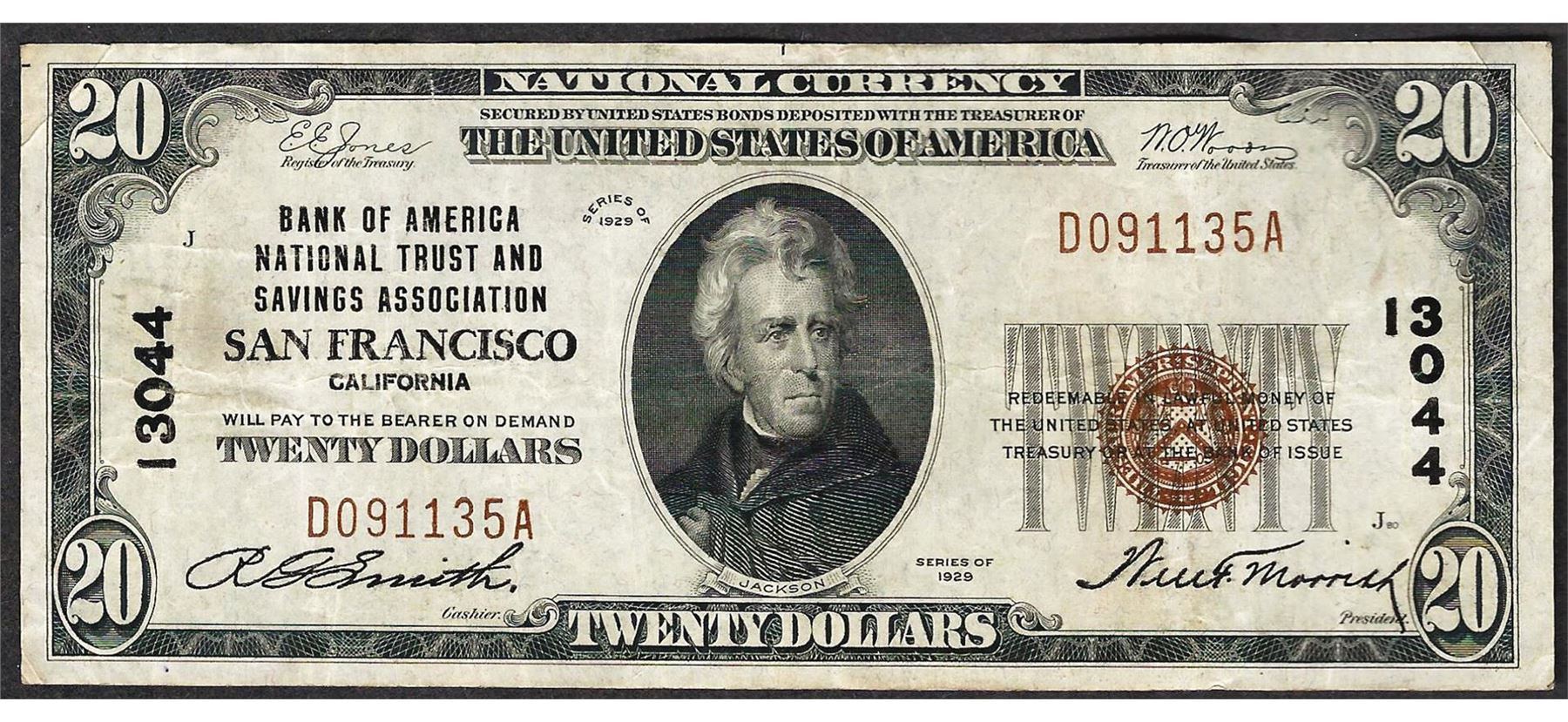 One 1929 $20 San Francisco California National Currency Note CH# 13044.